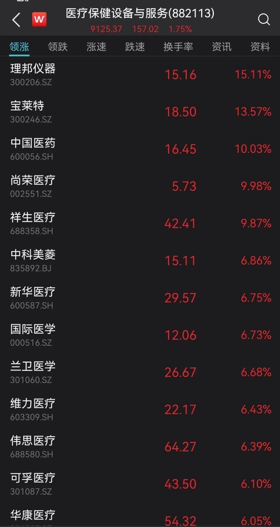 宝莱特、理邦仪器盘中触及涨停,华康医疗、迈瑞医疗、新华医疗等多股强势跟涨。