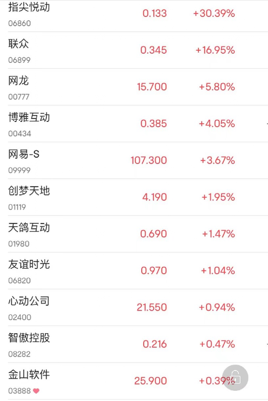11月18日,港股游戏股强势。指尖悦动大涨超30%,联众涨近17%,网龙涨近6%,博雅互动涨超4%,网易涨3.67%,创梦天地、天鸽互动、心动公司等跟涨。
