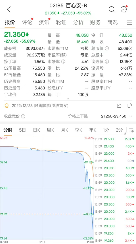 11月18日,医疗器械股百心安在收盘前一小时左右股价突然跳水,一度暴跌逾67%,收跌超55%,报21.35港元/股,最新总市值52.08亿港元。