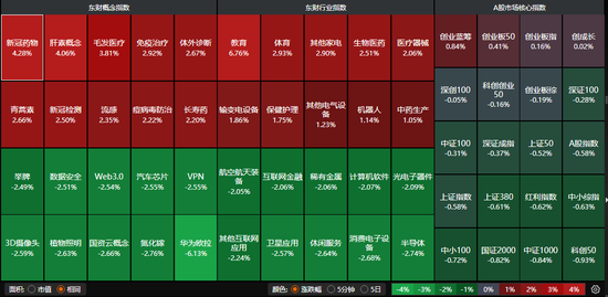 概念板块分化明显,医药生物概念股领跑,新冠药物、肝素概念、毛发医疗、免疫治疗、体外诊断、新冠检测概念板块大涨。