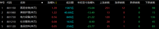 板块个股收跌居多,沪深两市共计1315只个股收涨,涨停股54只;3544只个股收跌,跌停股5家。医药生物、美容护理今日领涨,涨幅均超过1%,中国医药、金陵药业等12只个股涨停,以岭药业继续大涨超过6%收报46.28元/股。