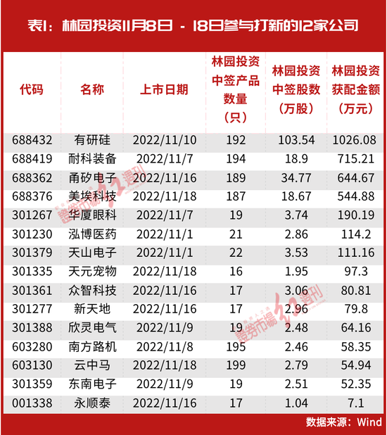 继月初通过打新买进了耐科装备、华厦眼科、泓博医药、天山电子4家公司后,统计11月8日~11月18日的新股机构获配情况,19只上市的公司中,林园投资成功参与了其中12家公司的打新,与此同时,在11月21日即将上市的锐捷网络的机构获配明细中,也同样出现了林园投资的身影。