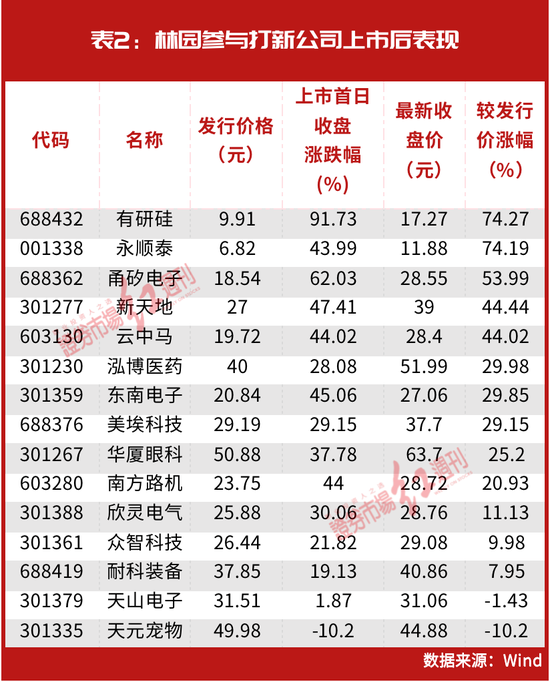 随着月内行情回暖,新股上市表现也迎来向好。近期林园参与打新金额最高的有研硅,公司发行价为9.91元,目前最新收盘价为17.27元,相较发行价涨幅达74.27%。而如果统计公司上市首日的表现,则首日涨幅更是高达91.73%(见表2)。