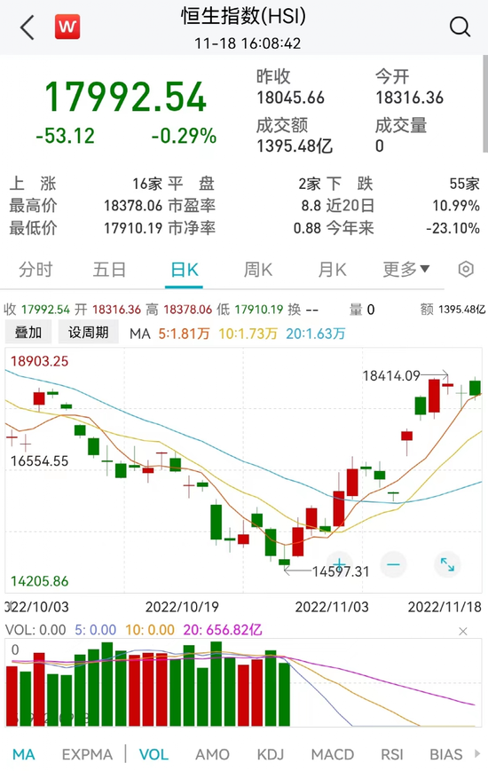 10月31日,恒生指数收盘跌至14687.02点,创下近十三年多新低,出乎意料的是,11月1日,恒生指数暴涨5.23%,之后13个交易日更是报复性拉升,11月以来恒生指数大涨22.51%,涨幅位居全球主要股指榜首。