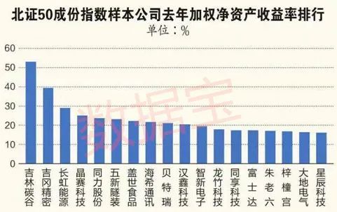 北证50成份指数样本公司(以下简称“样本公司”)多数仍属于中小型企业,共计有39家,整体盈利能力普遍较强。数据宝统计,50家公司2021年加权净资产收益率中位数为13.59%,高出非北交所公司净资产收益率中位数逾5个百分点。21家公司去年净资产收益率在15%以上,占比达到42%,吉林碳谷去年加权净资产收益率接近53%,居首。