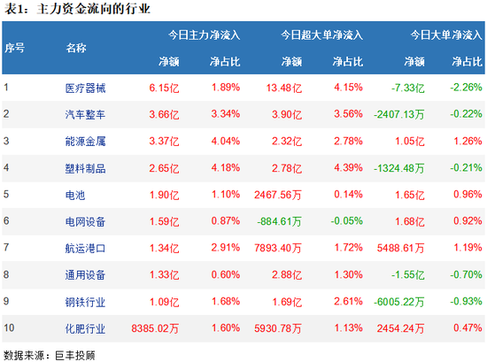 从两市行业板块资金流向来看,医疗器械板块获主力资金净流入6.15亿,汽车整车板块获主力资金净流入3.66亿,能源金属板块主力资金净流入3.37亿,塑料制品板块主力资金净流入2.65亿,电池板块主力净流入1.90亿。