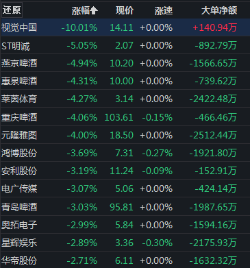 世界杯板块至收盘跌近2%,视觉中国跌停,元隆雅图、重庆啤酒、莱茵体育等跌超4%,星辉娱乐、华帝股份跌超2%,锋尚文化、中体产业跌近2%。