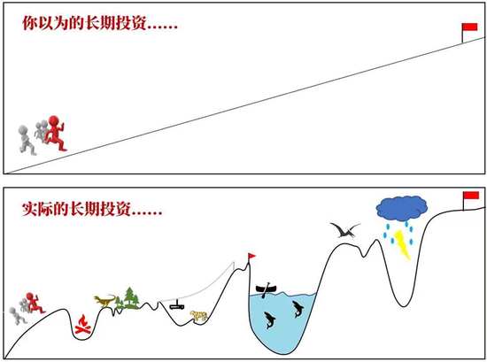 有的人认为长期投资是一条笔直倾斜向线上的直线,实际在长期投资中让人羡慕的长期投资收益,从来不是一帆风顺、一蹴而就的,它需要跨越无数的起起伏伏。正如“华尔街教父”本杰明·格雷厄姆所说:股票的价格就像狗,狗的主人就像是价值,遛狗时,狗忽远忽近到处跑,但总是会跑回人的身边。