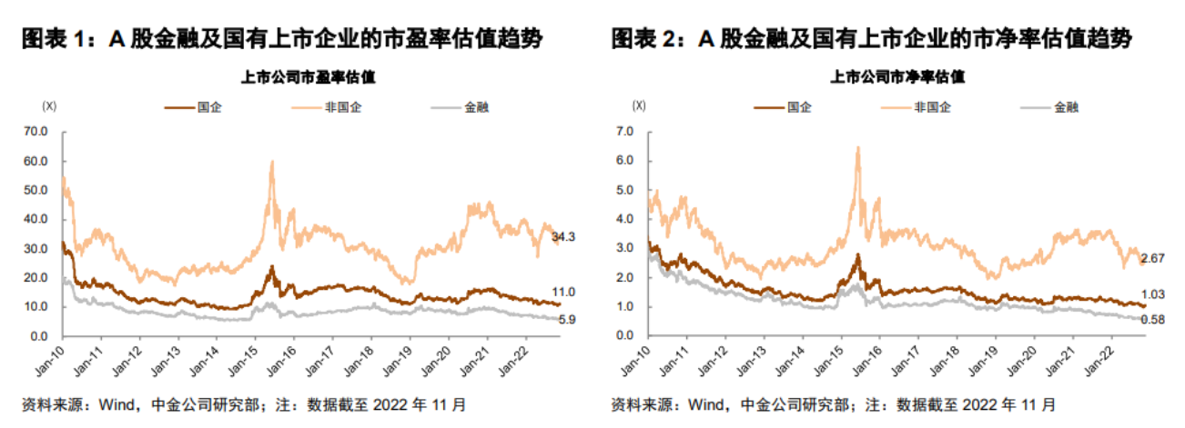 目前,国企上市公司的估值相比民企和外企普遍偏低,尤其是部分银行及国有上市企业。据中金公司研报数据,截至11月21日,上市国企和非国企的市盈率TTM估值分别为11.0倍和34.3倍;其中金融板块的估值更低,当前的市盈率和市净率分别为5.9倍和0.58倍,市净率估值已处于历史最低状态;上市银行的市盈率和市净率为4.3倍和0.51倍,股息率高至6.1%。