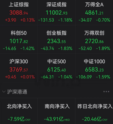 11月22日,A股三大指数全天分化,沪指临近午盘大幅拉升,午后又出现跳水,但在“中”字头股票大涨的支撑下红盘报收,深证成指、创业板指跌幅明显。截至收盘,沪指涨0.13%,深成指跌1.18%,创业板指跌1.83%。北向资金全天净卖出7.59亿元,其中沪股通净买入9.37亿元,深股通净卖出16.96亿元。总体上个股跌多涨少,两市超3700只个股下跌,今日合计成交8846亿元。
