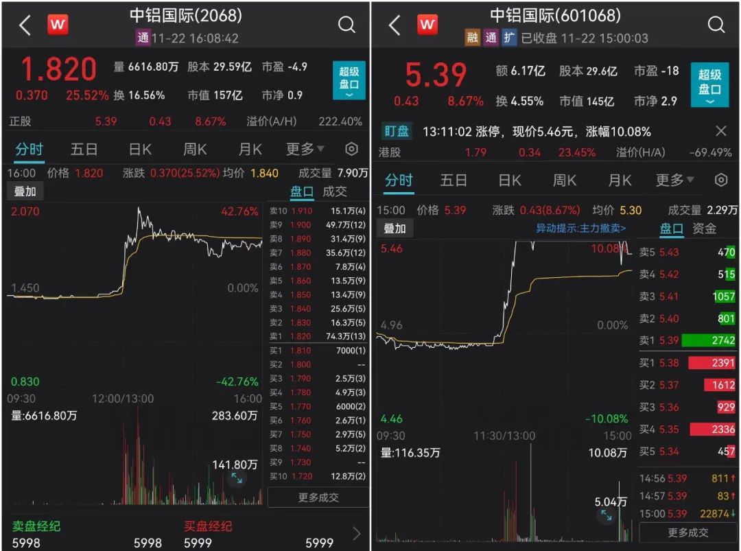 中铝国际港股午后直线拉升,股价一度涨超40%,收盘上涨25.52%;中铝国际A股尾盘打开涨停,收盘上涨8.67%。