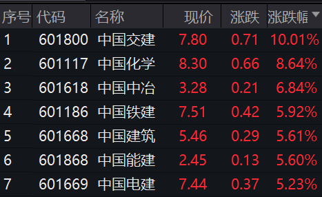盘面上,中字头个股盘中异动爆发,中铁装配“20CM”涨停,中国交建、中国联通、中成股份等涨停。教育股震荡走强,凯文教育、昂立教育、学大教育涨停。物流股一度冲高,三羊马涨停,天顺股份涨超8%。银行、航运等板块涨幅居前。