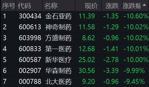 生物医药板块今日在早盘短暂冲高后一路震荡走低,掀起跌停潮。截至收盘,申万生物医药板块跌幅位居两市第一,金石亚药跌逾10%,神奇制药、方盛制药、华森制药等多股跌停,跌幅逾5%的股票超过70只。