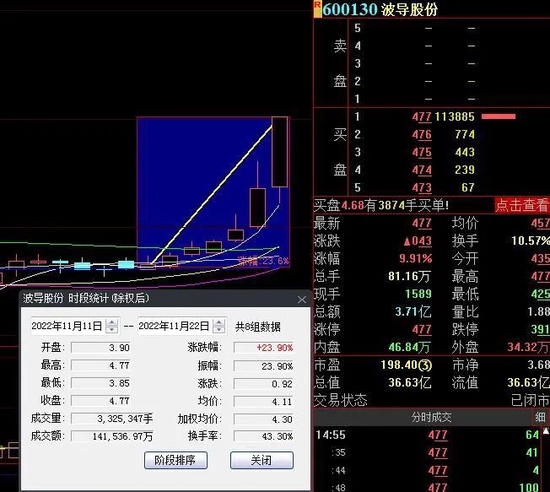 11月22日,波导股份冲至涨停,截至收盘,报4.77元,连续8个交易日实现上涨,累计涨幅达23.9%。