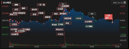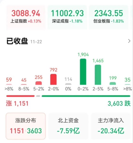 周二(11月22日)截至收盘,上证指数涨0.13%报3088.94点,深证成指跌1.18%报11002.93点,创业板指跌1.83%报2343.55点;两市合计成交8846亿元,北向资金净卖出7.59亿元。总体来看,个股跌多涨少。