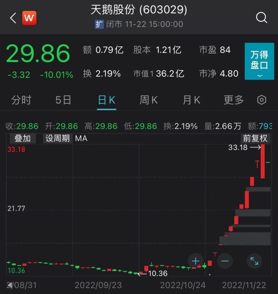 天鹅股份(603029)今日开盘即一字跌停,截至收盘,该股报29.86元,跌停板上封单仍有12万手。
