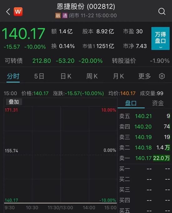 恩捷股份(002812)今日开盘即一字跌停,截至收盘,该股报140.17元,跌停板上封单达23万手。