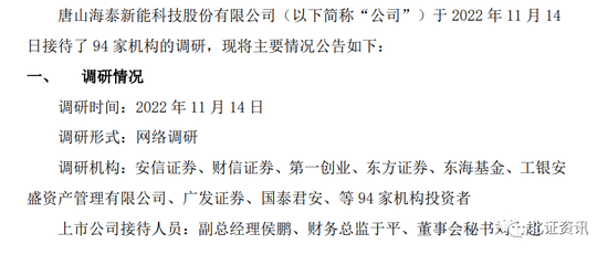 此前在9月13日,汇添富基金、嘉实基金、广发基金、富国基金、中信证券、中信建投等81家机构“组团”调研吉林碳谷,创下北交所公司单次接待机构调研数量最多的纪录。不过,在11月16日海泰新能发布接待机构调研的公告后,这项纪录被打破了。据公告,11月14日安信证券、财信证券、第一创业、东方证券、东海基金、工银安资产管理有限公司、广发证券、国泰君安等94家机构集体对公司进行了调研。此外,锦好医疗、森萱医药、万通液压、天马新材、凯德石英等公司的单次调研阵容中,参与机构数量均超过50家。