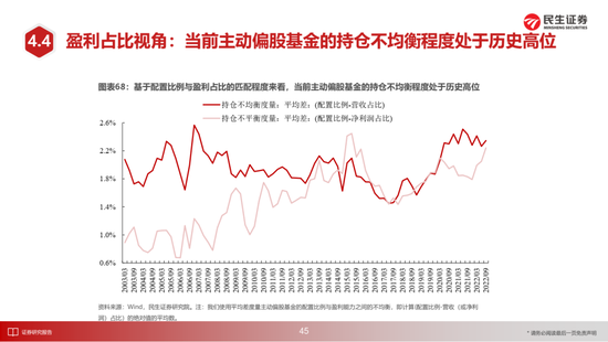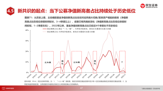 高景气投资经历了其黄金时期,其来源并非景气本身,而是线性外推的环境。但是当下景气的孤岛正在被更多进入者分食利润,其来源正好是过往的传统行业的不景气。另一方面,长期护城河型公司多少程度面对分配机制的改革,城市扩张、资本累积和精英阶层崛起的消费品多少将面对冲击。长期回报正在变得愈发不可测,然而当下主流机构的配置却大幅偏离上市公司的营收和净利润占比,特别是在景气投资的高端制造与依赖于长期DCF估值的行业中。这是一种极度依赖于对于未来资本回报判断能力的决策。在我们描述的场景下,市场投资者风格本身就有向不确定性再均衡的诉求。同时我们发现当下创新高且未出现历史最大回撤的基金规模占比已经连续4个季度处于历史低位,这非常类似于2012-2013和2015-2016风格大切换的前夜,春江水暖鸭先知,净值新高者也表现出了对于共识以外地方更多的关注。