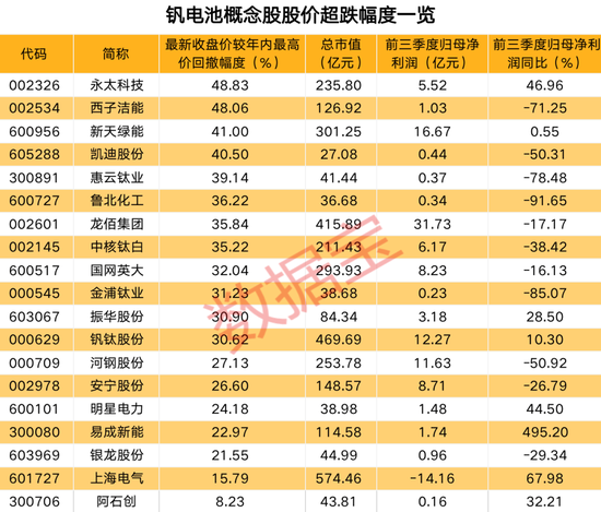 不少钒电池概念股的股价目前处于阶段低位,12只概念股最新收盘价较年内高点回调幅度超30%,其中永太科技、西子洁能、新天绿能、凯迪股份的回调幅度均超40%。