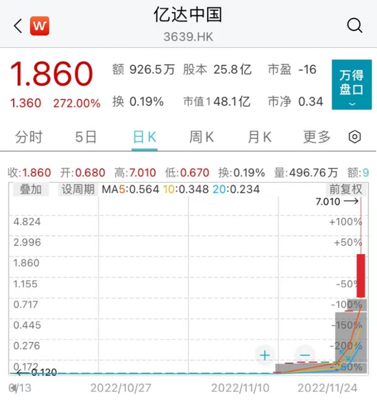 此外,若按亿达中国今日股价高点7.01港元计算,该股两日已暴涨45倍。