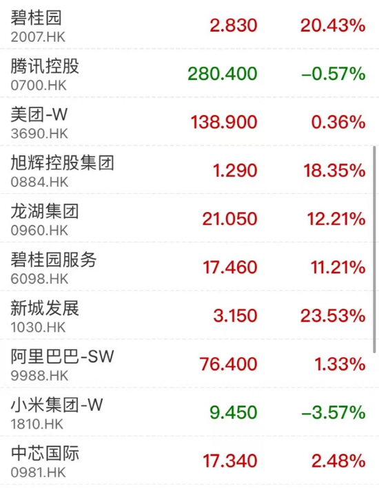 盘面上,金融16条支持房地产正式发布,内房股与物管股携手大涨,碧桂园涨超20%领涨蓝筹,新城发展涨超23%;电力股走强,瑞声科技、华能国际电力股份涨超5%;权重科技股涨跌各异,网易、百度涨超2%,阿里巴巴、快手涨超1%,小米绩后跌近4%,京东跌2%。