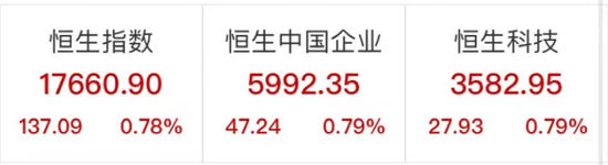 截至收盘,恒生指数收涨0.78%,报17660.9点;恒生科技指数涨0.79%,报3582.95点;恒生国企指数涨0.79%,报5992.35点。