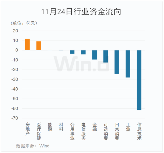 从11月24日行业资金流向来看,主力资金净流出100多亿元,多数板块净流出。其中,信息技术板块净流出60多亿元,位居首位;工业、日常消费、可选消费等板块亦大幅净流出。房地产、医疗保健等板块小幅净流入。