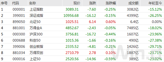截至11月24日收盘,上证指数跌0.25%报收于3089.31点;深成指跌0.15%报收于10956.68点;创业板指跌0.21%报收于2335.52点,万得全A总成交7485亿元。