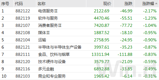 从下跌板块来看,电信服务、软件与服务、消费者服务、媒体、运输等板块跌幅居前。