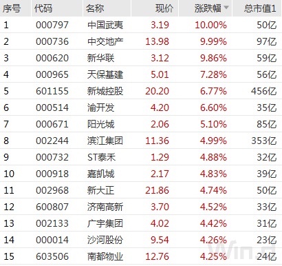从涨幅居首的房地产板块来看,中国武夷、中交地产、新华联涨停,天保基建、新城控股、渝开发、阳光城、滨江集团、ST泰禾、嘉凯城、新大正、济南高新(维权)、广宇集团、沙河股份、南都物业等个股亦涨幅居前。