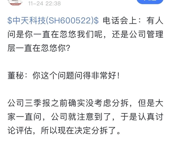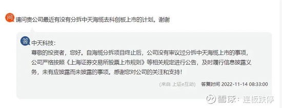 随后,投资者有点炸锅。因为,就在前阵子的本月14号,中天科技说好没这个打算的。