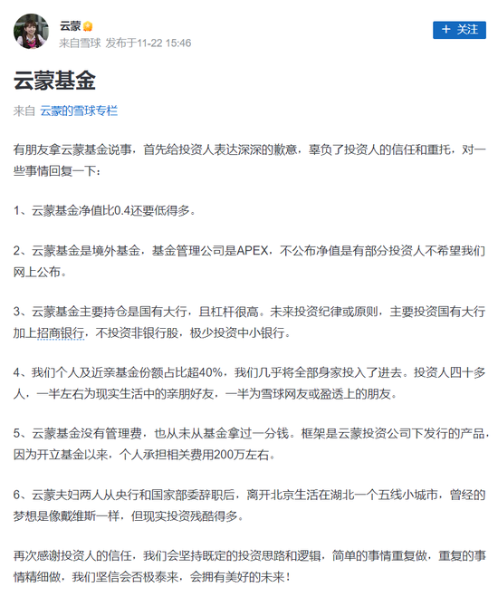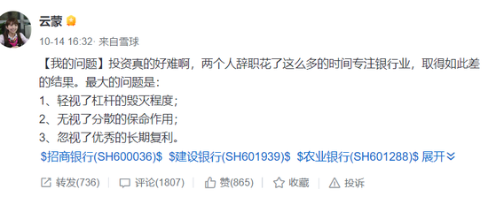 此前有媒体报道,云蒙夫妇,曾经风光无限,靠一轮大牛市在银行股中狂赚2000万,作为雪球上拥有40万粉丝的顶部账号,云蒙被认为是雪球研究银行股的三位大神之一。