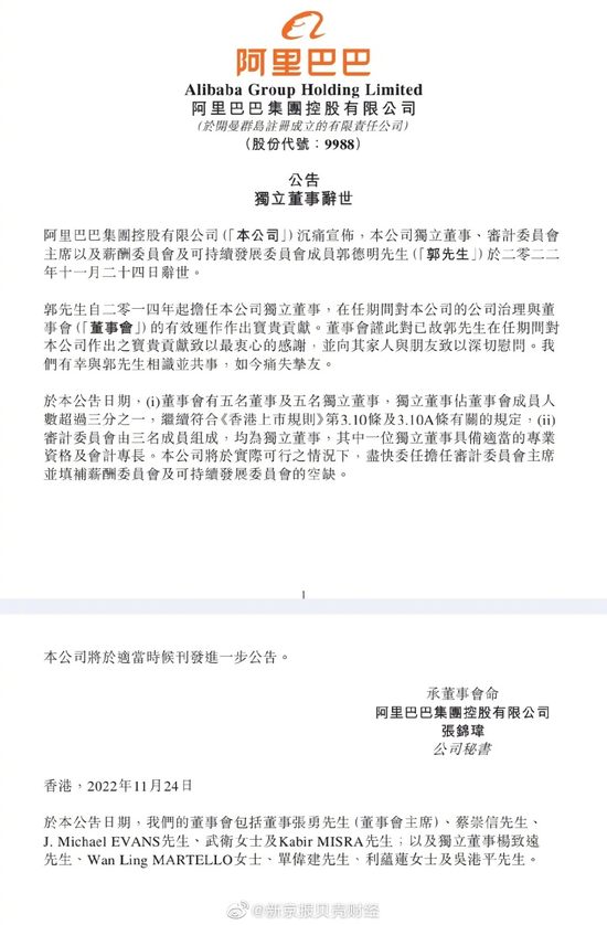 阿里巴巴11月24日公告,公司沉痛宣布,公司独立董事、审计委员会主席以及薪酬委员会及可持续发展委员会成员郭德明于2022年11月24日辞世。