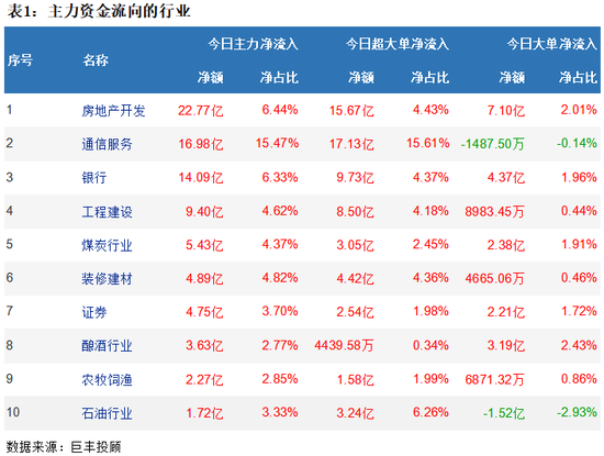 从两市行业板块资金流向来看,房地产板块获主力资金净流入22.77亿,通信服务板块获主力资金净流入16.98亿,银行板块主力资金净流入14.09亿,工程建设板块主力资金净流入9.40亿,煤炭板块主力净流入5.43亿。