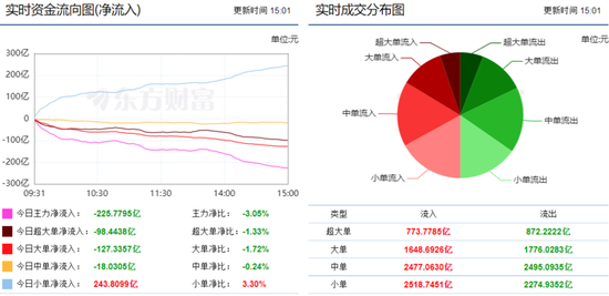 从两市主力资金流向来看,截止收盘,沪深两市主力资金呈现大幅净流出状态,两市共流出225.7795亿元。其中,超大单净流出98.4438亿元,大单净流出127.3357亿,中单净流出18.0305亿元,小单净流入243.8099亿元。