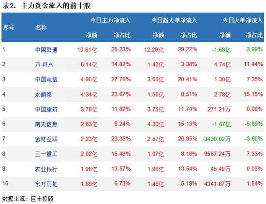从两市个股主力资金流向来看,中国联通获主力资金净流入10.61亿,万科A获主力资金6.14亿净流入,中国电信获主力资金净流入4.90亿,永顺泰获主力资金净流入4.34亿,中国建筑获主力资金净流入3.78亿。