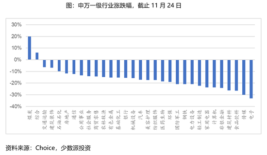 分行业来看,截至11月24日,大部分行业都有不同程度的回撤,行业走势分化明显,电子、传媒、食品饮料领跌,涨幅居前或跌幅较少的行业主要是资源品和稳增长产业链,这种结构分化这也让很多赌赛道的主题性基金一再跌破净值。