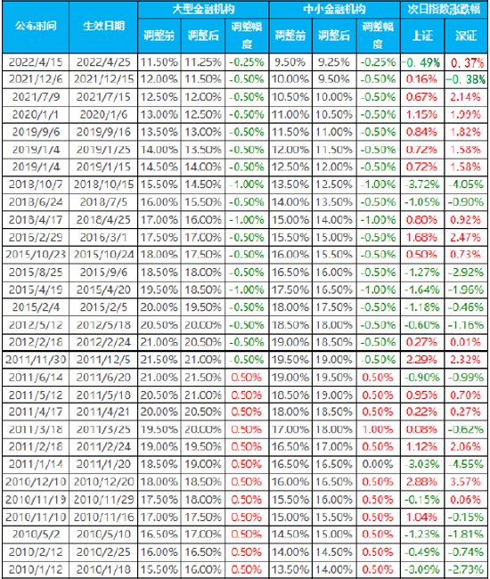 对A股影响方面,降准降息等宽松货币政策的实施通常有利于提振市场走强。中长期看,降准之后A股走势的核心逻辑是宏观经济修复程度。2010年以来历次央行公布降准后首个交易日,上证指数与深证指数表现如下: