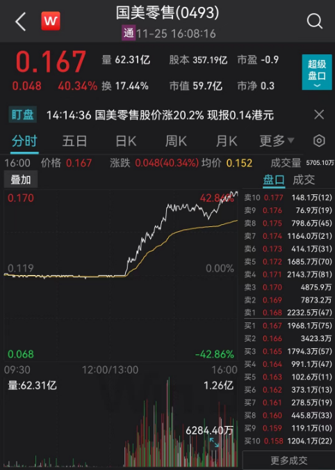 受全国门店启动直播的消息刺激,港股国美零售午后大幅拉升,收盘涨幅超过40%,国美通讯也直线拉升封板。