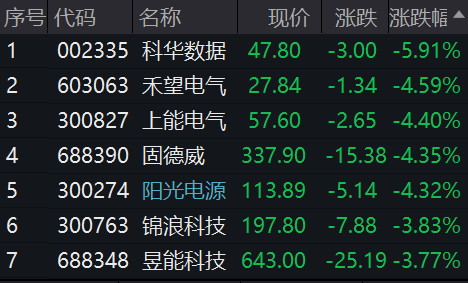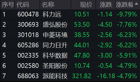 储能板块中,科力远跌近10%,盛弘股份、申菱环境、科华数据均跌逾5%,派能科技、鹏辉能源跌幅也超过4%。