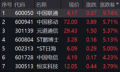 中国联通午后一度涨停,带动以三大运营商为代表的电信板块大涨,位居A股涨幅榜首位。截至收盘,中国联通差1分钱涨停,中国移动涨逾5%,中国电信涨幅也超过4%。