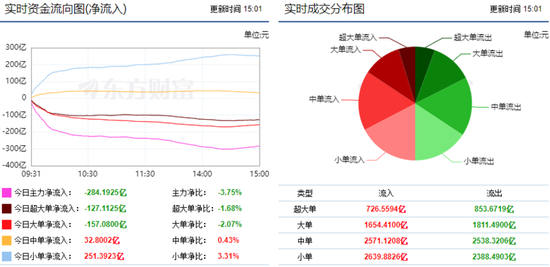 从两市主力资金流向来看,截止收盘,沪深两市主力资金呈现大幅净流出状态,两市共流出284.1925亿元。其中,超大单净流出127.1125亿元,大单净流出157.0800亿,中单净流入32.8002亿元,小单净流入251.3923亿元。