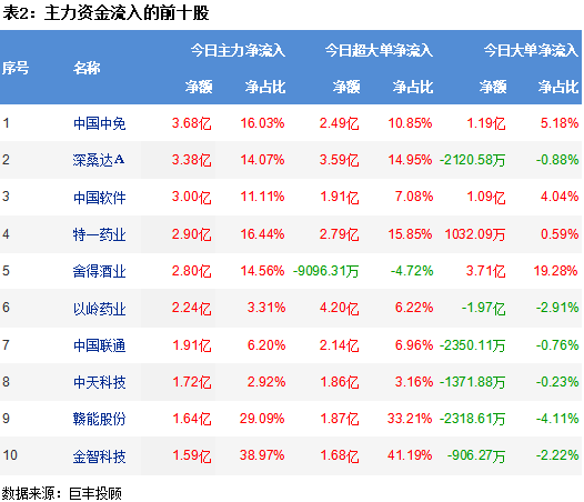 从市场个股资金流向来看,获得主力资金净流入排名前十情况如下: