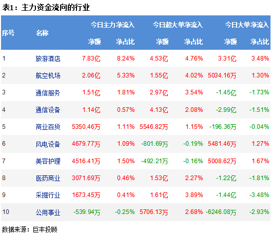 从两市行业板块资金流向来看,旅游板块获主力资金净流入7.83亿,航空机场板块获主力资金净流入2.06亿,通信服务板块主力资金净流入1.51亿,通信设备板块主力资金净流入1.14亿,商业百货板块主力净流入5350.46万。