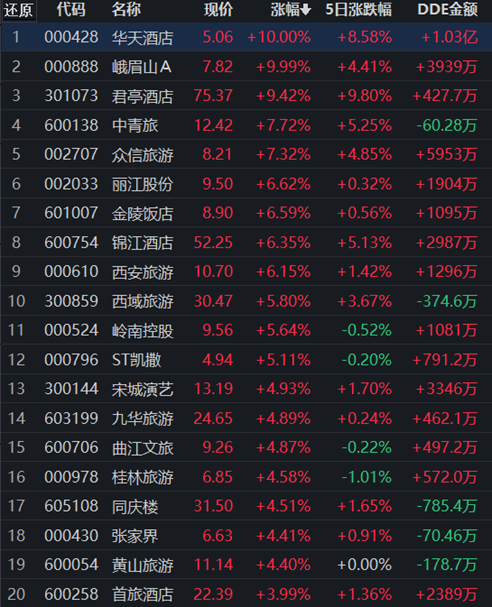 标的方面,东莞证券表示,国内防疫工作优化逐步推进,旅游出行信心有望逐渐修复。国际航线客运力同比增长近九成,出入境限制逐渐松动,推荐优先受益于出入境限制放松的出境游龙头众信旅游(002707);机场免税业务有望复苏的免税龙头中国中免(601888);建议布局业绩弹性较大的景区个股云南旅游(002059)、天目湖(603136)、宋城演艺(300144);建议关注具有餐饮宴会+预制菜成长属性的同庆楼(605108)等。