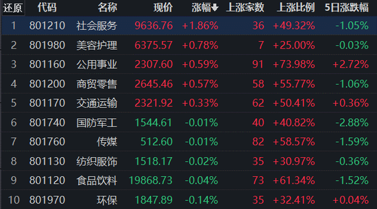 31类申万一级行业中,有5类上涨,其中,社会服务涨幅达1.86%,居首,美容护理和公用事业紧随其后;下跌方面,银行跌幅居前,下跌1.85%。