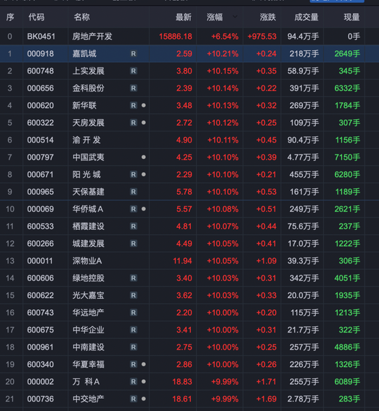 在Z哥看来,上述两个“恢复”,可以说是楼市调控政策的重要转向。正是这一重磅政策的发布,激发了今天整个地产股板块的集体井喷。整个地产股板块,超过30只地产股涨停,其中万科、金地集团、华夏幸福、华发股份、金融街等悉数涨停,保利发展上涨9.6%。