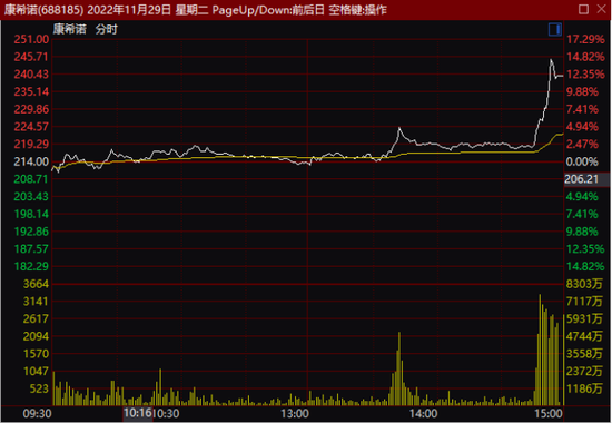 康希诺A股原本表现较为平静,下午多数时间涨幅在2%上下,临近尾盘直线拉升,自14:45分起在很短时间内最多向上拉升约15%,盘中涨幅一度高达17.29%,随后有所回落,但截至收盘,仍大涨12.09%,成交量快速急剧放大。