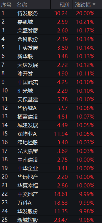 港股地产股也集体大涨,大发地产涨超64%,德信中国、三巽集团等涨超30%,融创服务、世茂服务等涨超20%,此外,碧桂园服务、龙湖集团等内房股均大幅上涨。